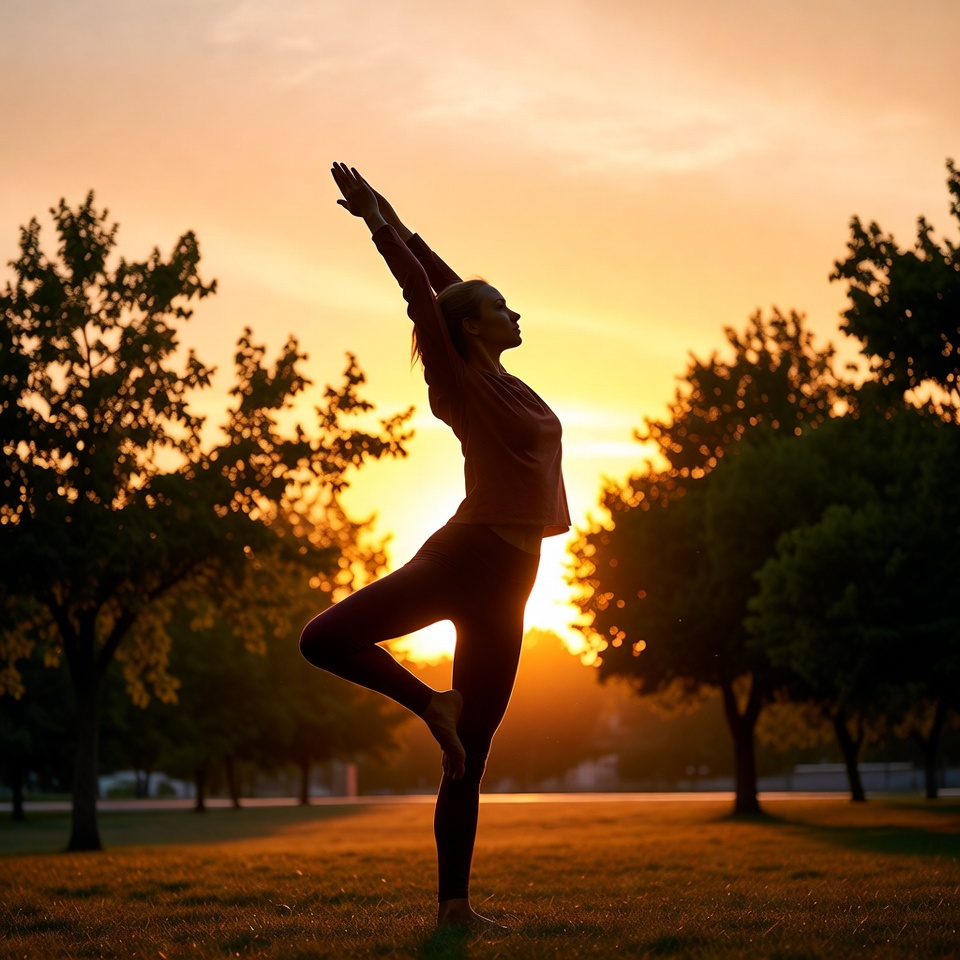 A woman practices yoga outdoors at sunset, balancing on one leg among trees. The sun sets in the background, creating a warm glow.
