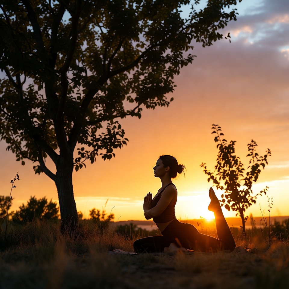 A person performs yoga at sunset near a tree. The sky shows warm colors as daytime ends. The atmosphere appears focused and calm.