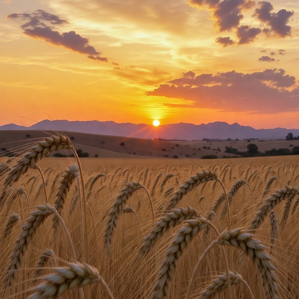 Wheat sways gently under the setting sun. The sky shows hues of orange and yellow. Mountains are visible in the distance at sunset.
