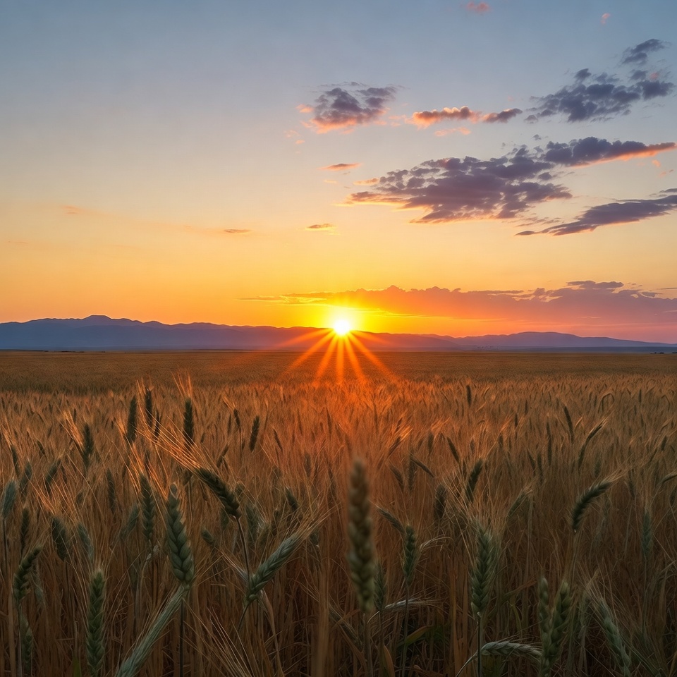 The sun sets over a vast wheat field, casting warm light and shadows across the golden crop. Clouds are visible in the sky.