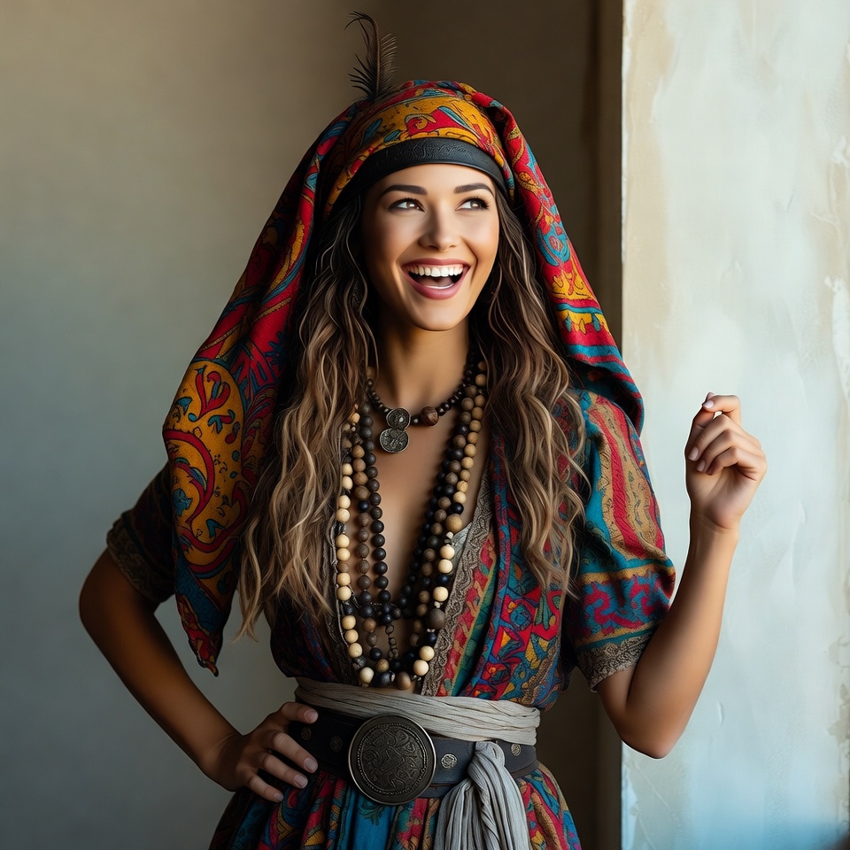 beads, beauty, clothing, colorful, culture, dress, ethnic, expression, fashion, hair, happiness, headscarf, indoor, jewelry, long hair, portrait, smiling, traditional, window, woman