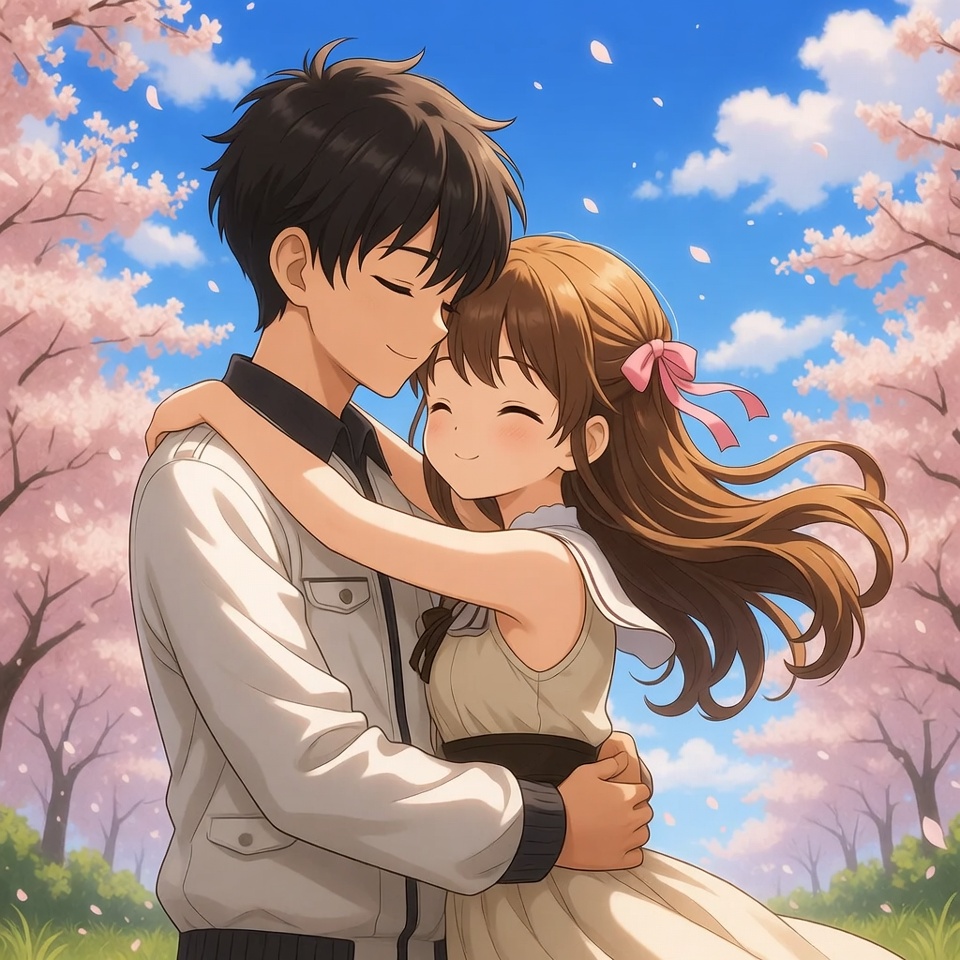 Two young people embrace in a spring setting filled with cherry blossoms under a bright blue sky.