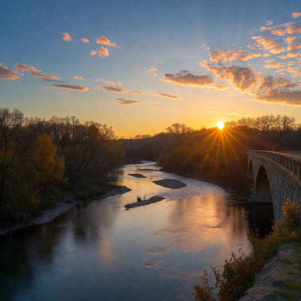 Sun sets behind a bridge and trees alongside a river. Clouds reflect colors of evening sky. Cool air brings calmness to the scenery.