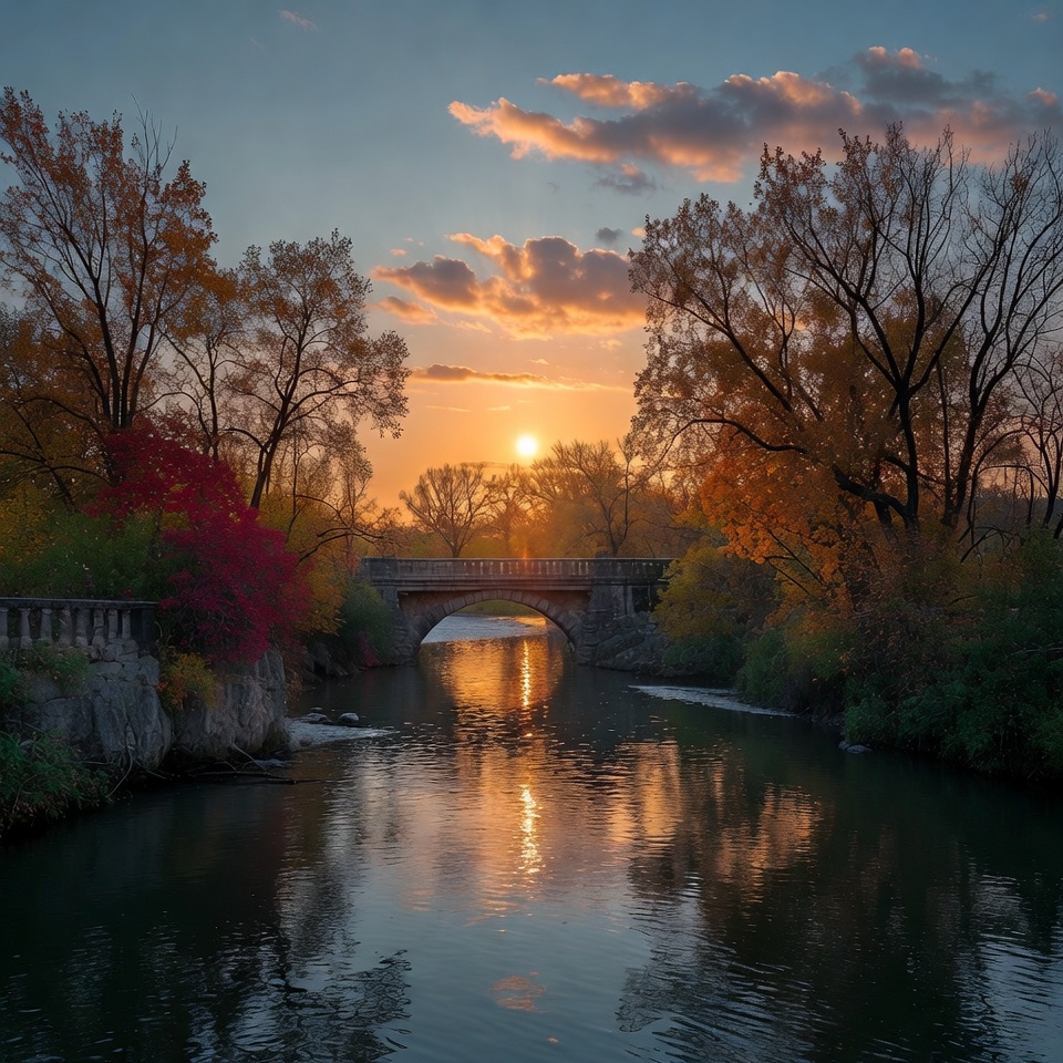 The sun sets behind trees along the river. A bridge crosses the water, with reflections on the surface. Colors of autumn are visible.