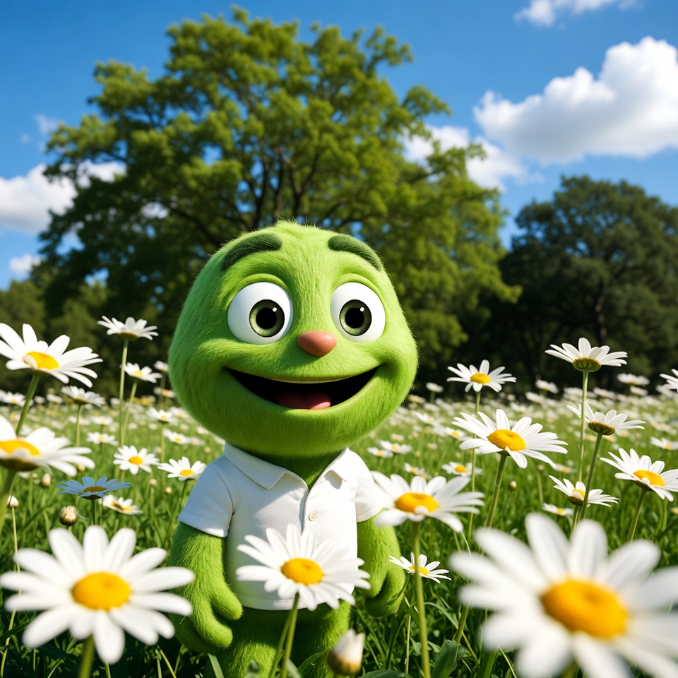 animated, blue sky, cartoon, character design, cheerful, clouds, daisies, flower field, grassy area, green character, green color, joy, landscape, nature, outdoors, playful, smiling, summer, sunny day, white flowers