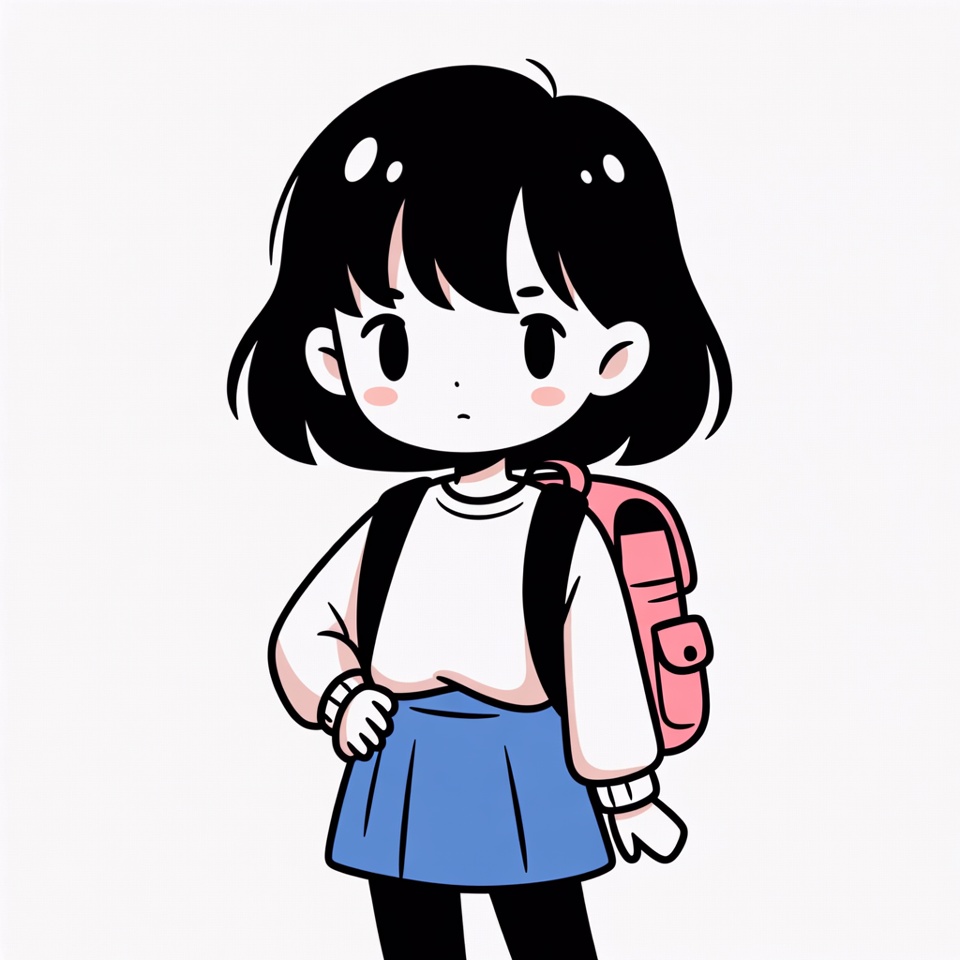 backpack, cartoon style, casual wear, character, children, design, education, fashion, girl, illustration, lifestyle, minimalist art, outfit, playful, posing, school, serious expression, student, urban, youth