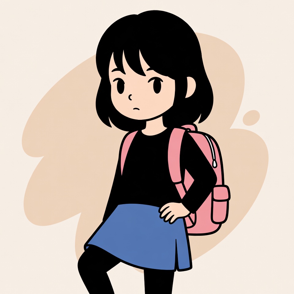 A girl stands confidently wearing a black top and blue skirt with a pink backpack. She looks serious in this simple setting.