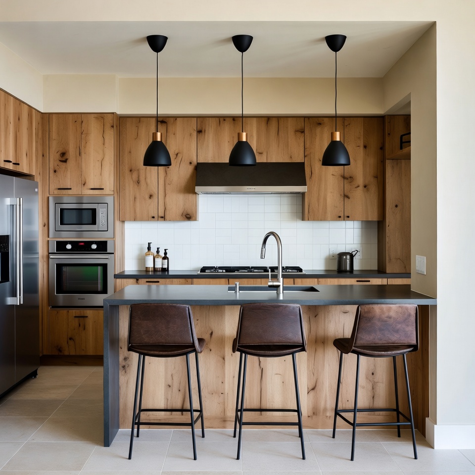 A kitchen features wooden cabinets and a central island with stools. Modern appliances are arranged neatly. Three pendant lights hang above.