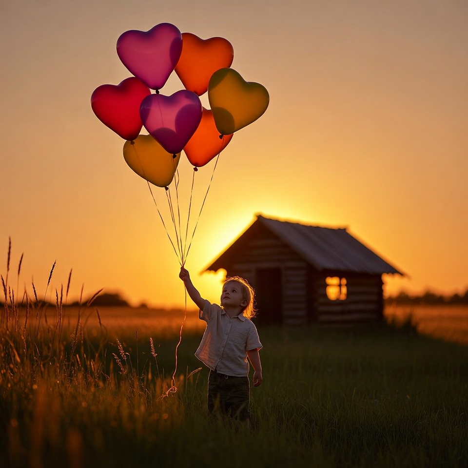 A child stands in a field holding colorful balloons during sunset. A small house is silhouetted in the background.