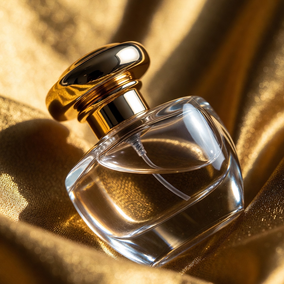Clear perfume bottle on gold fabric