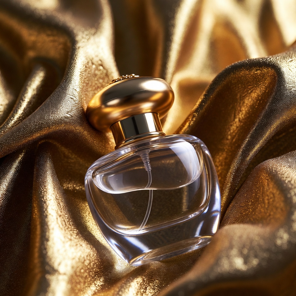 A clear glass bottle with a gold cap sits on crumpled golden fabric, reflecting light in an elegant display.