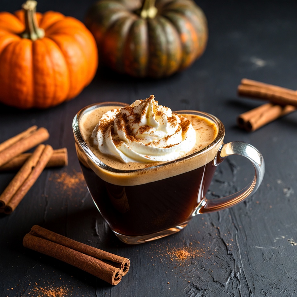 A person sips coffee topped with whipped cream while surrounded by pumpkins and cinnamon sticks. Autumn vibes fill the scene.