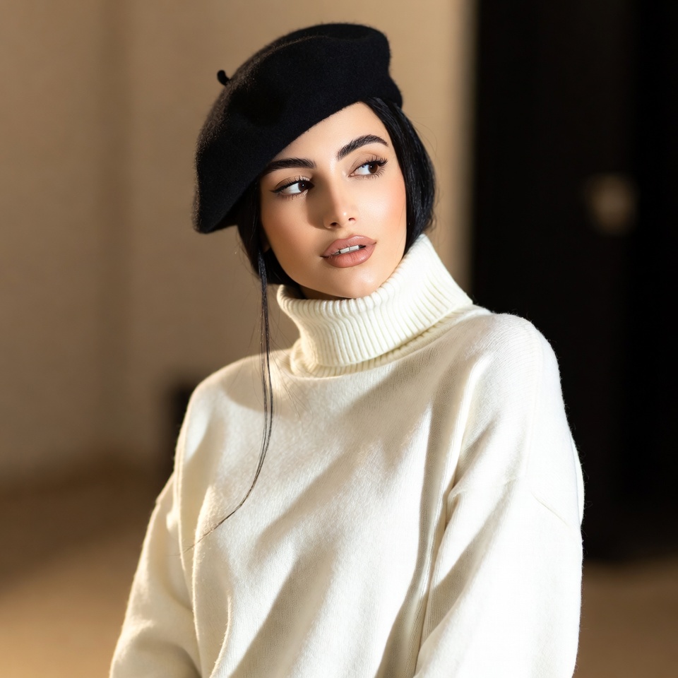 beauty, beret, black, casual, clothing, elegance, expression, fashion, hair, indoor, lifestyle, lighting, model, modern, portrait, style, sweater, thoughts, turtleneck, woman