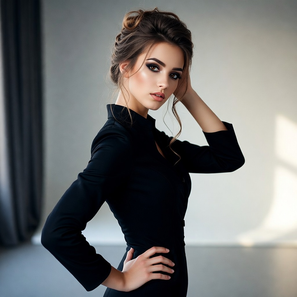A young model is posing with a hand on her head. She wears a black outfit and has styled hair. The background shows a room with light.