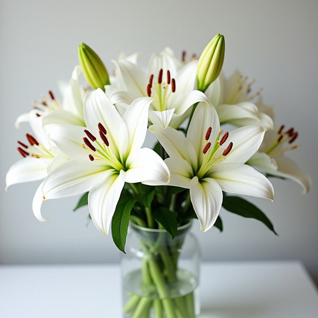 A bouquet of white lilies is arranged in a clear glass vase on a table. Some blooms are open while others are still in buds.
