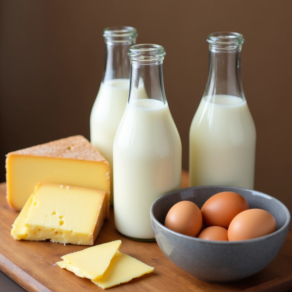 Three glass bottles with milk sit next to cheese and eggs on a wooden board. The setup showcases fresh food items ready for use.