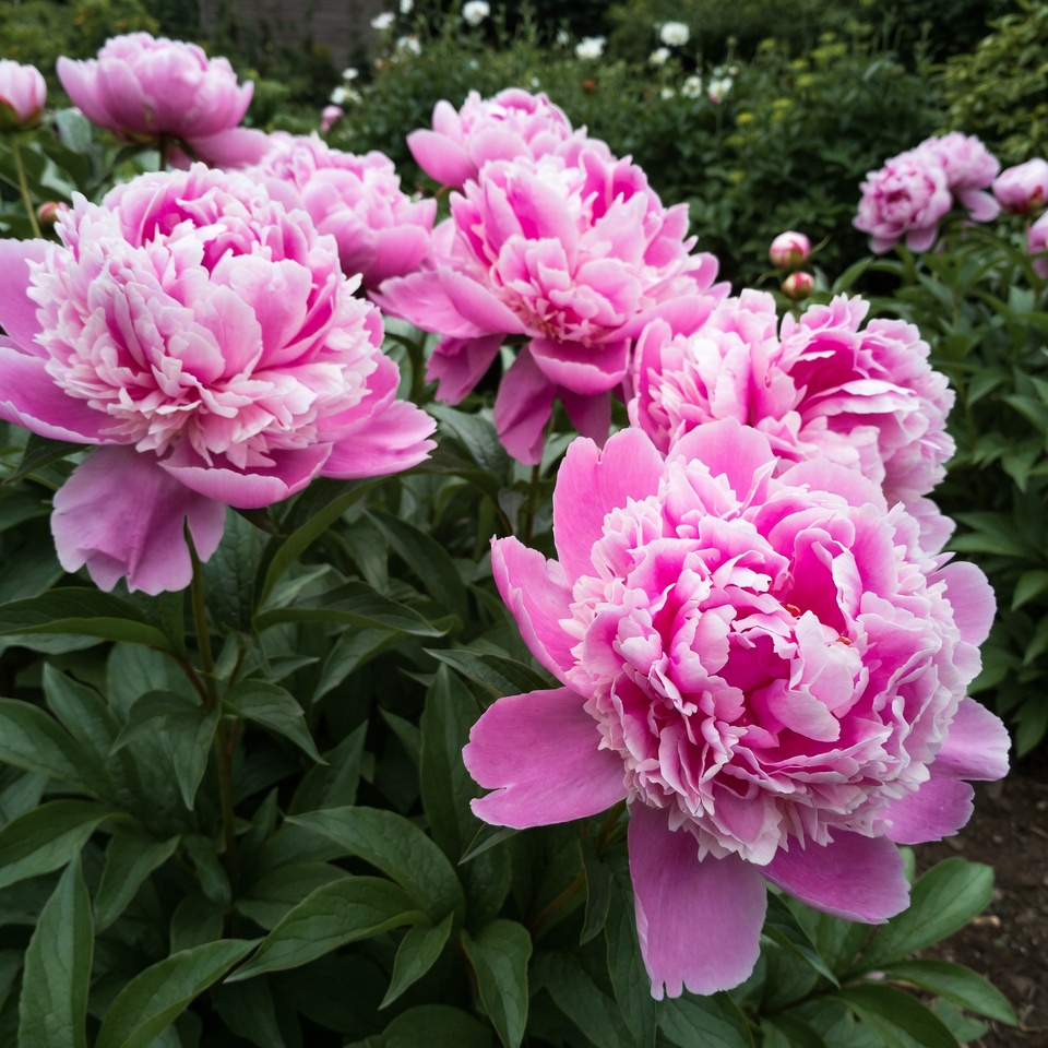 Bright pink peonies stand tall in a garden setting on a sunny day, showcasing their full, lush petals surrounded by green leaves.