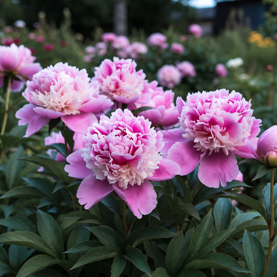 Pink peonies bloom in a garden during spring. The flowers show layers of petals and are surrounded by green leaves and other flowers.