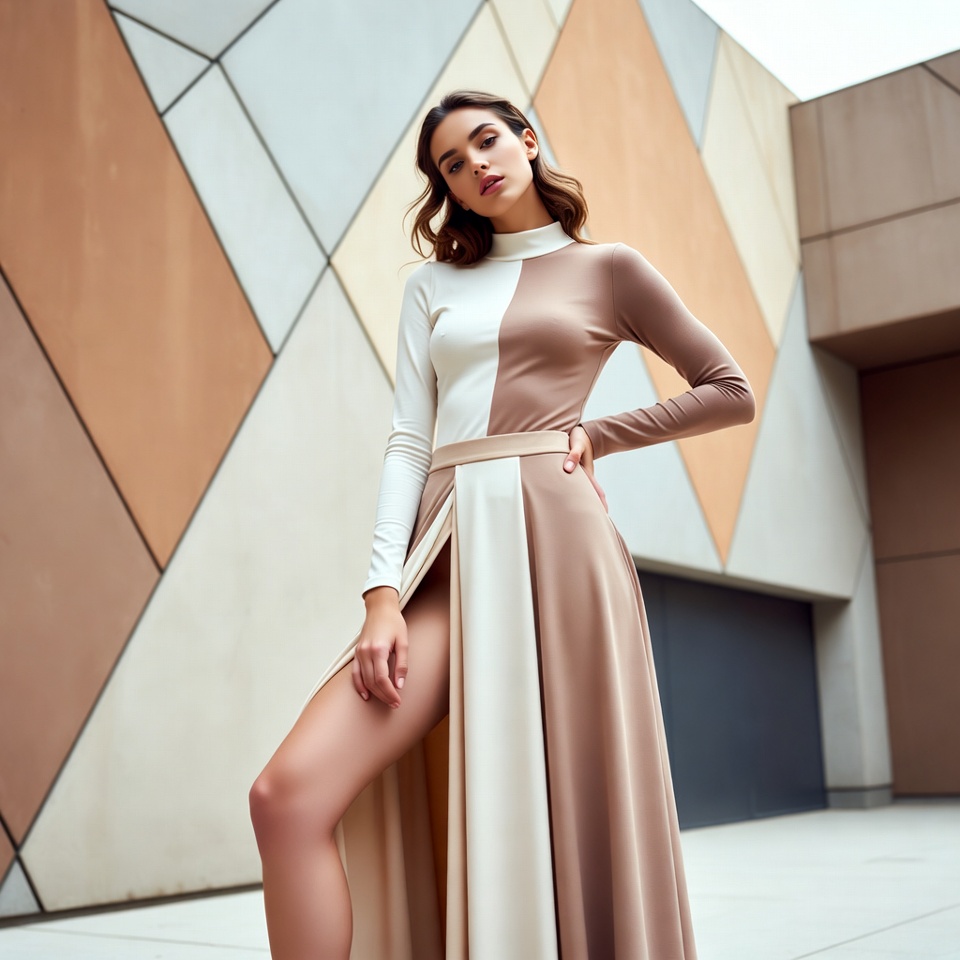 A model stands confidently in a unique outfit with a split design. She poses in front of a geometric building on a sunny day.