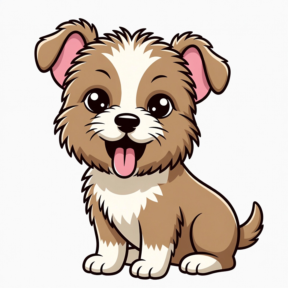 A cartoon dog sits with a big smile. It has brown and white fur and large eyes. The background is plain and simple.