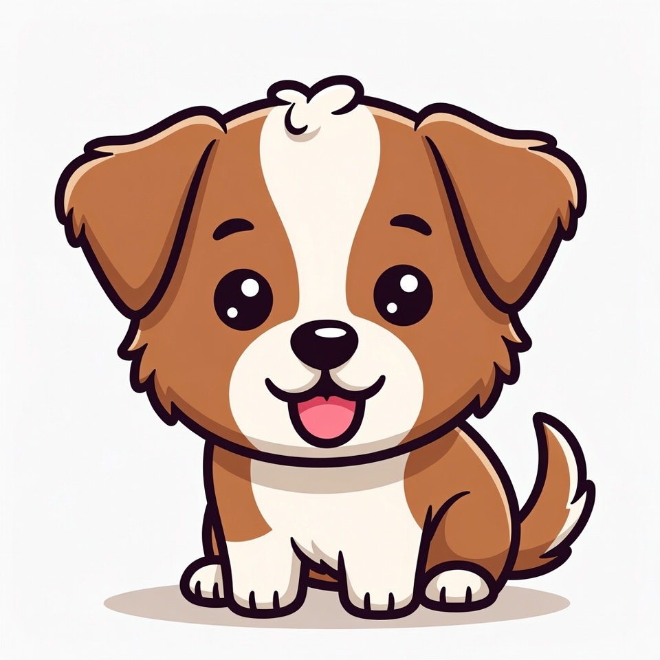A cartoon dog sits with a happy expression. It has brown and white fur and a wagging tail. The dog's playful demeanor shows joy.