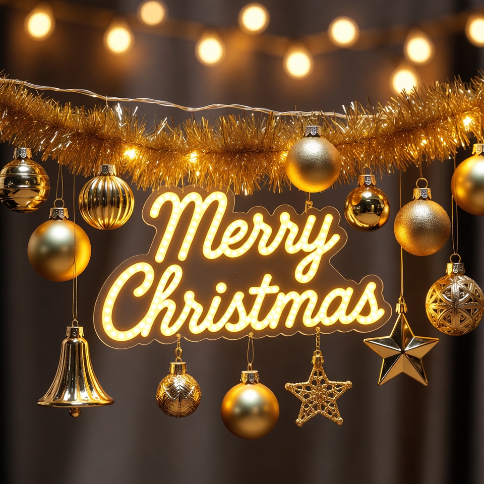 String of gold ornaments and a sign saying Merry Christmas hang above a dimly lit background, creating a holiday atmosphere with lights.