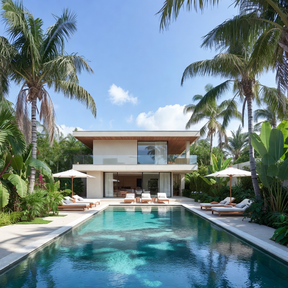 A modern villa is located among palm trees with a swimming pool. Lounge chairs sit beside the water under umbrellas on a sunny day.