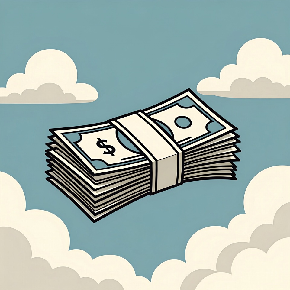 A stack of cash is seen floating among white clouds against a blue sky. This creates an unusual and imaginative scene.