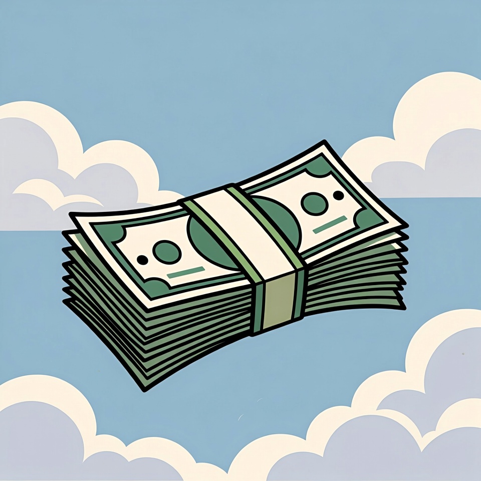 Bundles of cash rest on clouds under a blue sky. The scene shows money in a whimsical setting.
