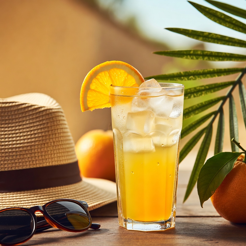 Drink with ice sits on a table. A hat and sunglasses are beside it. Oranges are visible in the background. Sunlight is present.