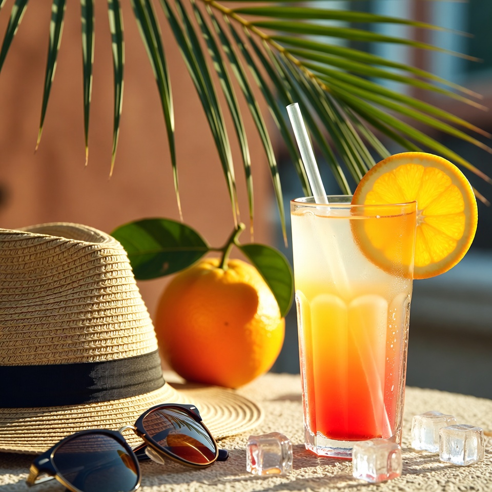 A refreshing drink with orange and ice sits on a table by a palm tree. Sunglasses and a straw hat add to the summer vibe.