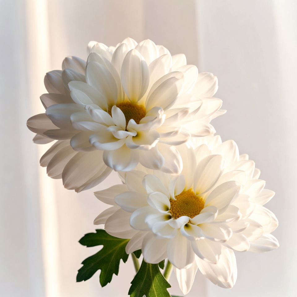 Two white daisies stand together, showcasing their bright yellow centers. They are illuminated by sunlight coming through a nearby window.