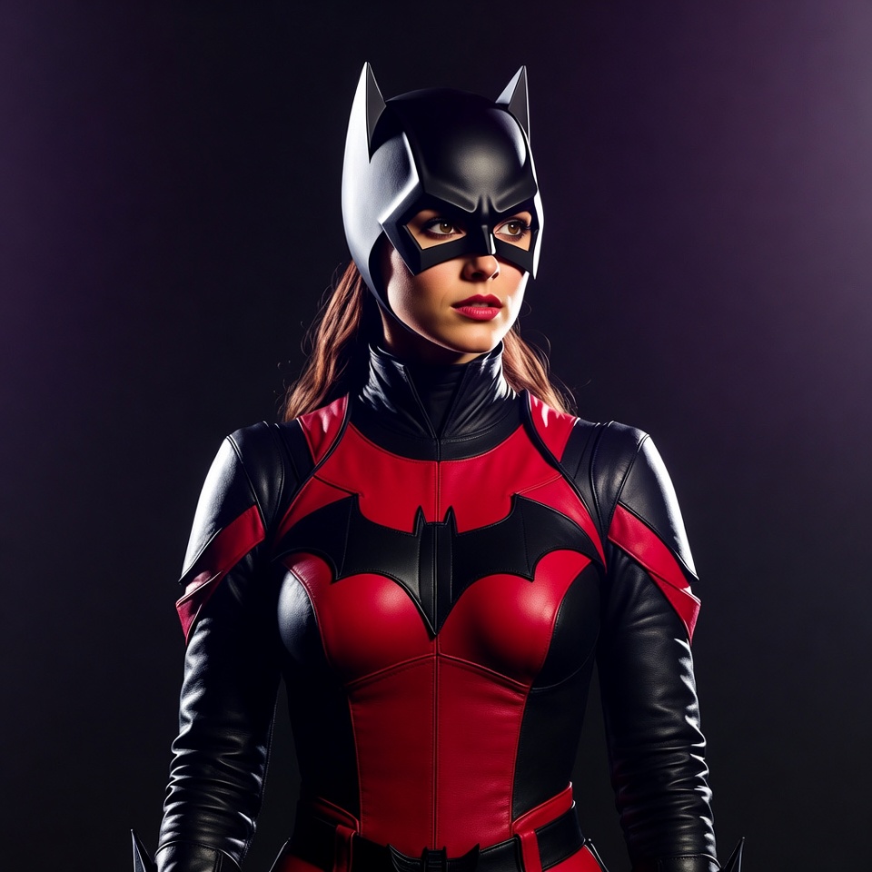 Batwoman stands confidently in a red and black costume. The background is dark, highlighting her strong stance and expression.