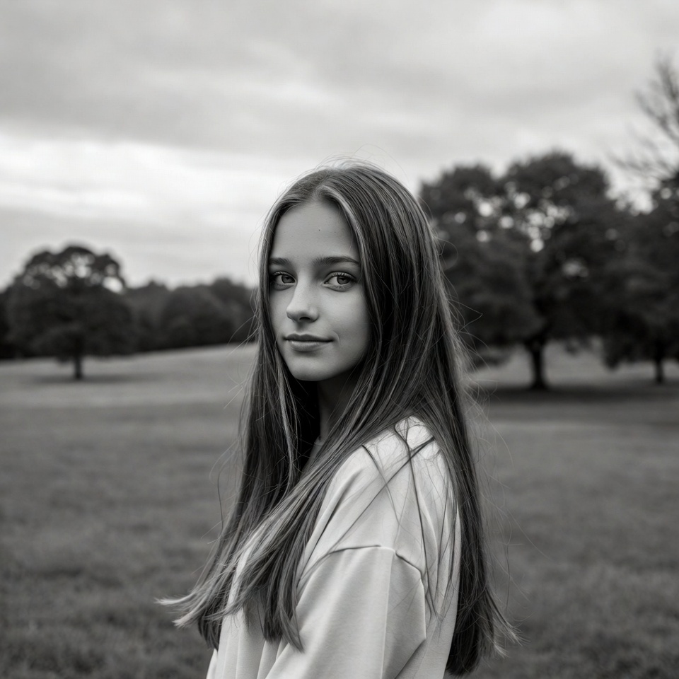 A girl looks towards the camera while standing in a grassy field surrounded by trees on a cloudy day.