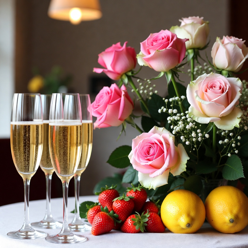 bouquet, celebration, colors, decor, drinks, event, flowers, freshness, fruit, gathering, glassware, joy, lemons, nature, party, roses, sparkling, strawberries, table, toast