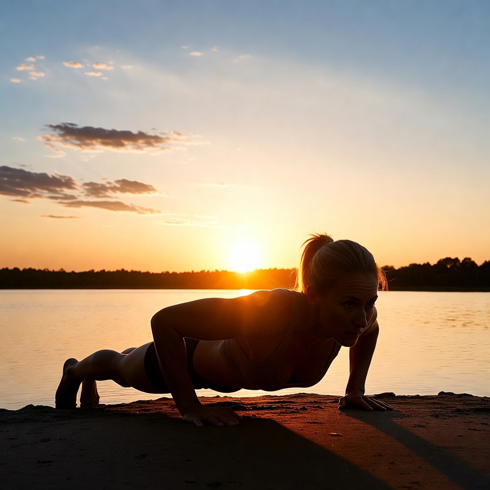 Woman doing push-ups at sunset by water