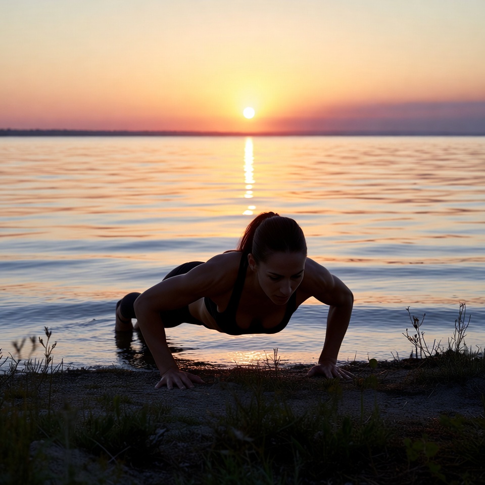 A person does push-ups at the edge of a lake during sunrise. The sun rises above the horizon, creating a reflective scene on the water.
