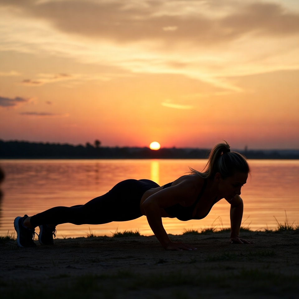 A person does push-ups by the lake during sunset. The sky shows colors as the sun sets behind the water.
