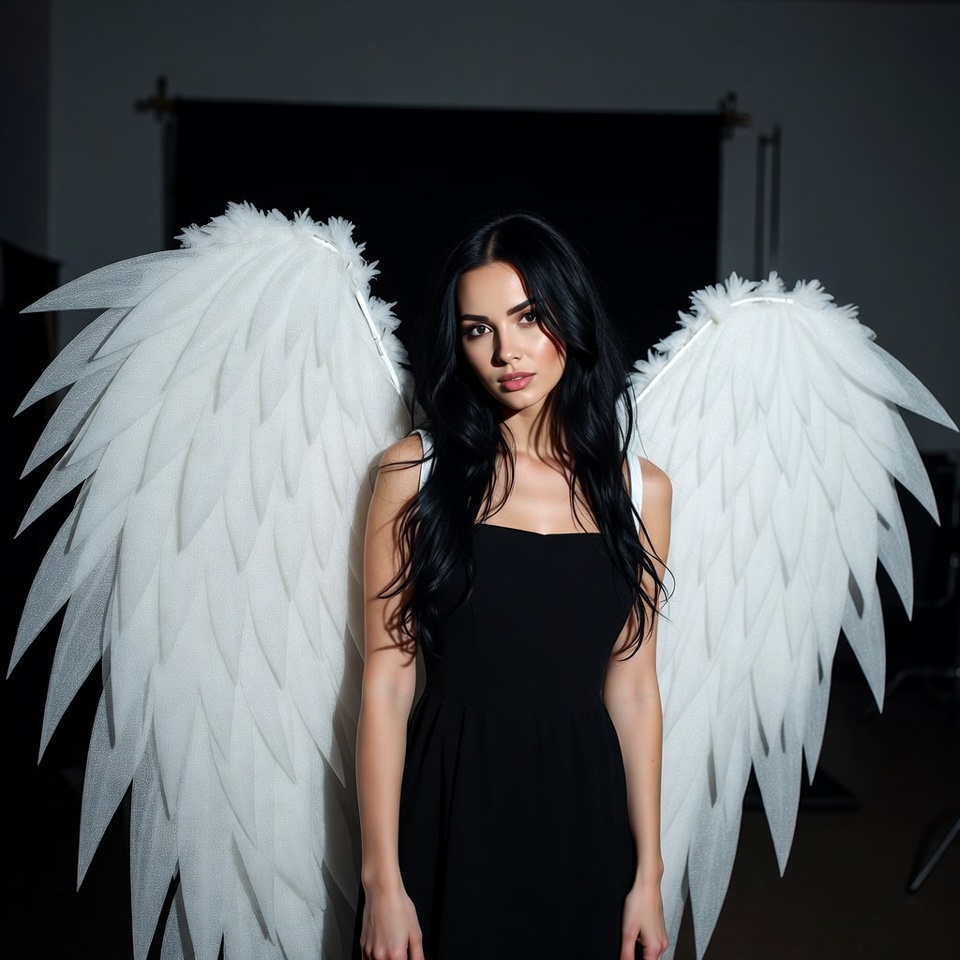 Model stands in studio wearing black dress and large white wings. The scene is set for a creative photoshoot with dramatic lighting.