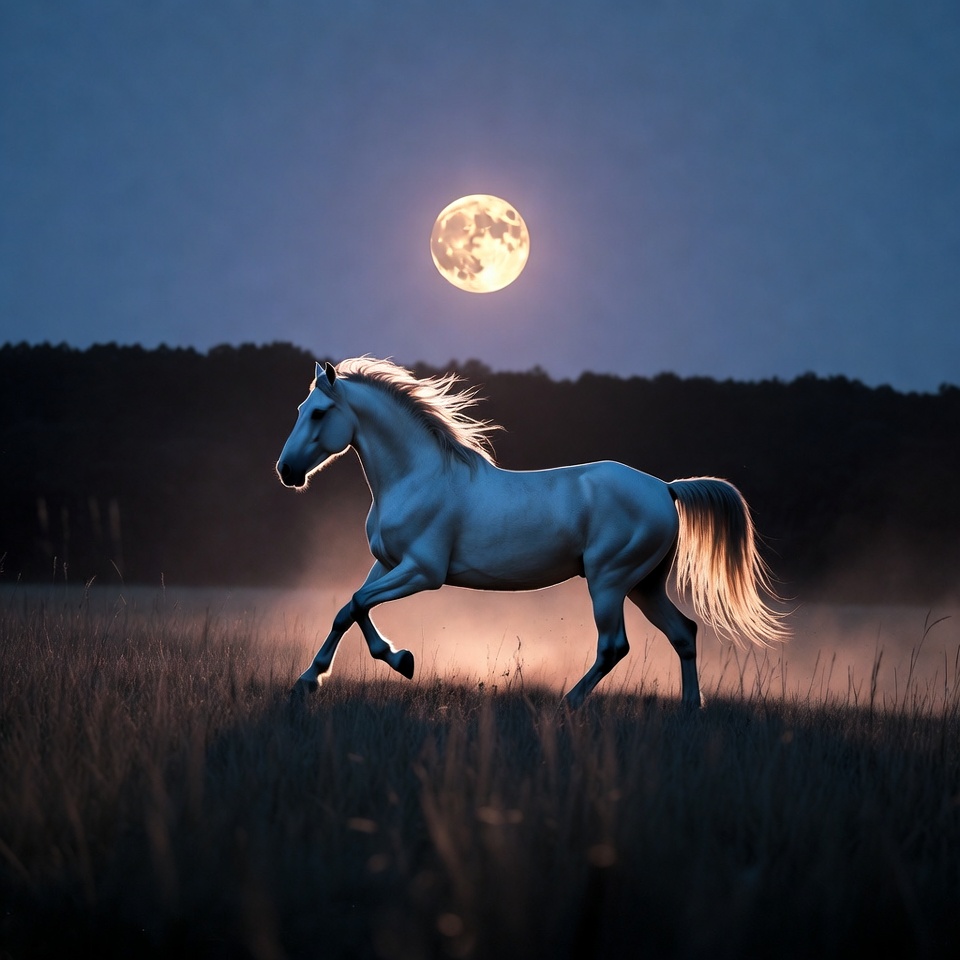 A horse runs across a field during the night. The full moon shines brightly in the sky, creating a beautiful scene.