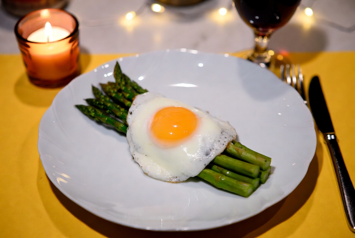 asparagus, candle, cooking, dining, dinner, evening, food, fresh, fried egg, gourmet, healthy, kitchen, light, meal, nutrition, plate, recipe, simple, tasty, vegetables