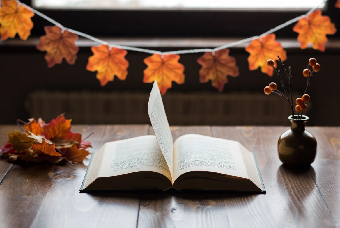 An open book rests on a wooden table. Nearby, colorful autumn leaves and a small vase with berries add to the seasonal setup.
