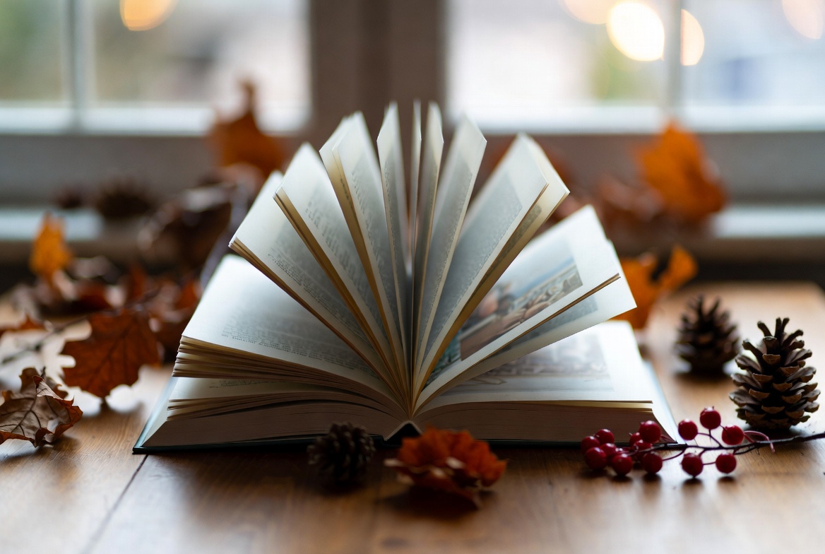 An open book sits on a wooden table surrounded by autumn leaves and pine cones. The light filters through a nearby window.