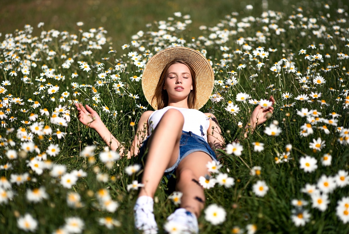 beauty, body, calmness, casual, daisies, day, enjoyment, field, flowers, grass, leisure, meadow, nature, outdoor, relaxation, resting, spring, sun hat, sunlight, woman