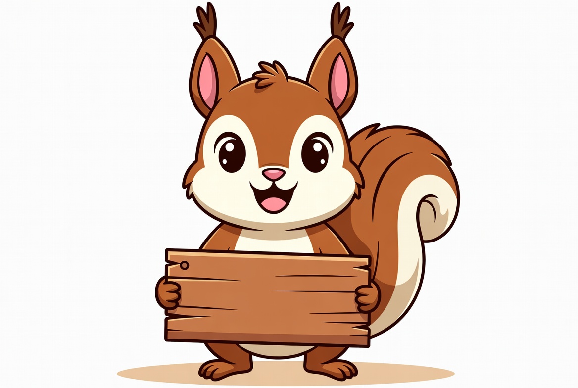 A cartoon squirrel stands with a big smile while holding a wooden sign. It has fluffy fur and large, bright eyes.