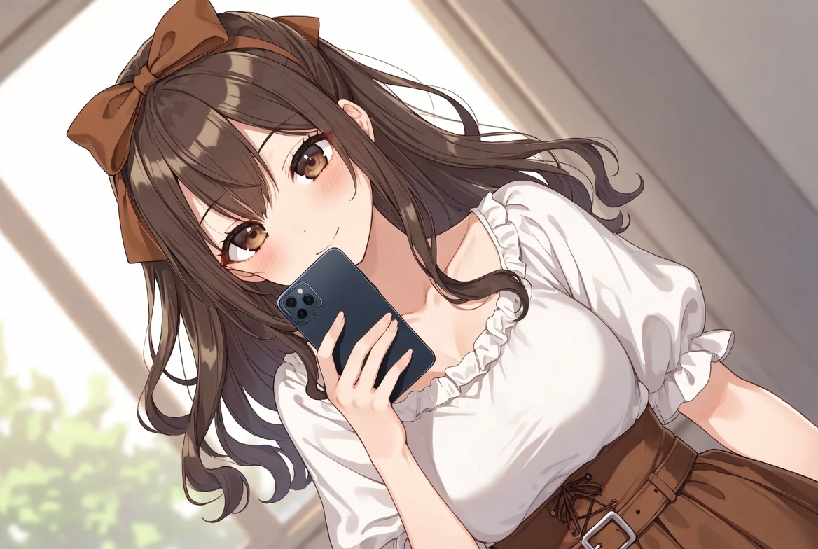 A young woman stands in a room and looks at her phone. She has long hair and wears a top with puffed sleeves and a skirt.