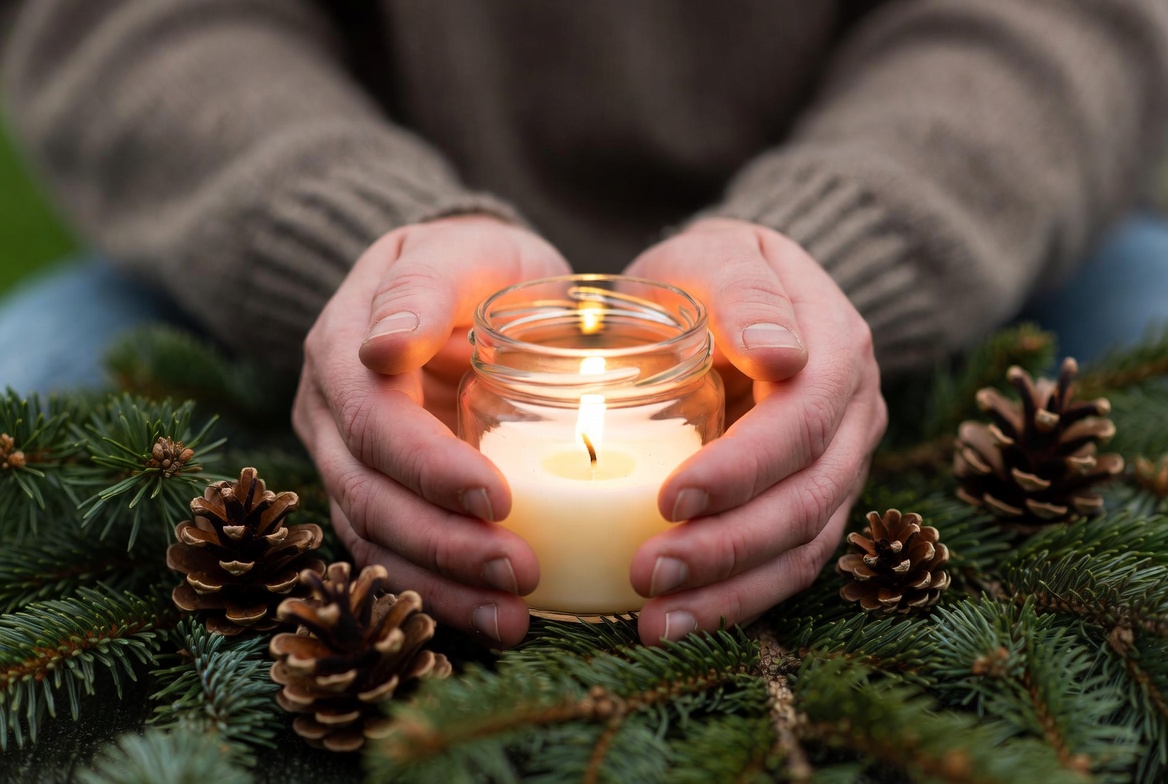 Person holds a lit candle with both hands among pine branches and pine cones. The scene is set in a cozy atmosphere during winter.