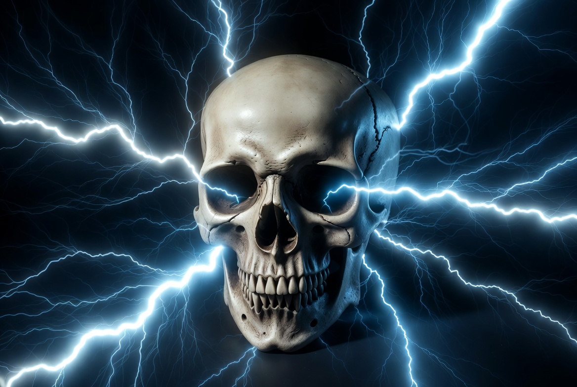 A skull is shown surrounded by bolts of electric light in a dark setting. The contrast creates a striking visual effect and focus.