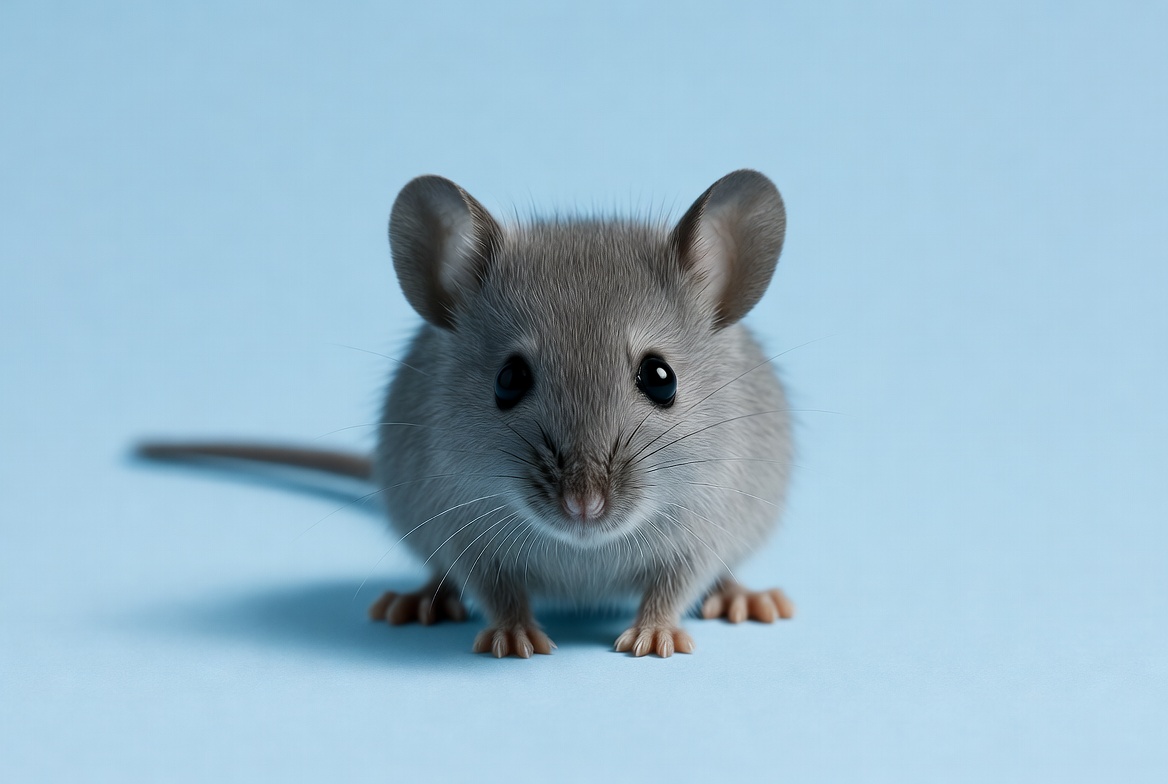 A small gray mouse stands on a light blue surface, looking curiously at the viewer. Its round eyes and tiny paws are visible.