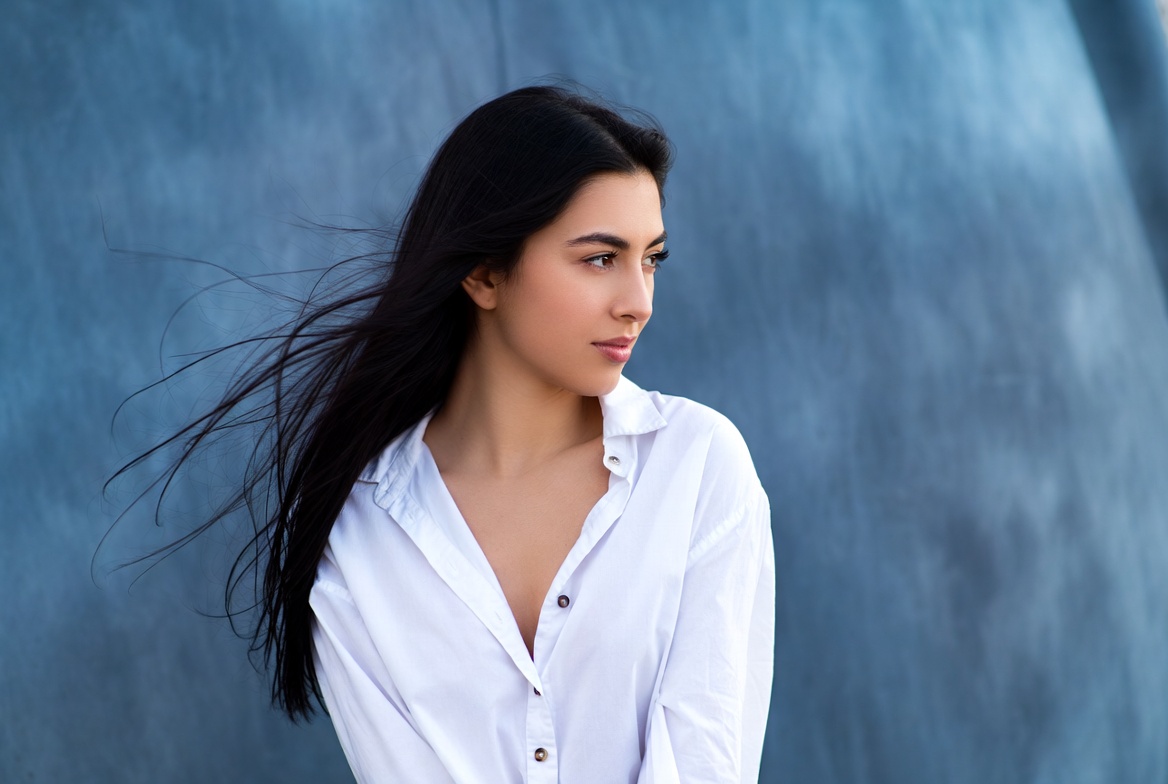 appearance, beauty, blue background, casual, expression, fashion, hair, headshot, model, natural light, outdoor, portrait, posing, serene, shirt, style, thoughtful, wind, woman, young adult
